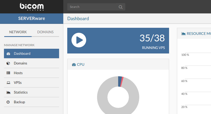 Deployments of VPSs, management and distribution of server resources and monitoring of overall system status is implemented through a comprehensive, user friendly GUI. This lessens the need for highly skilled Linux technical resources to be deployed and frees time for other items.